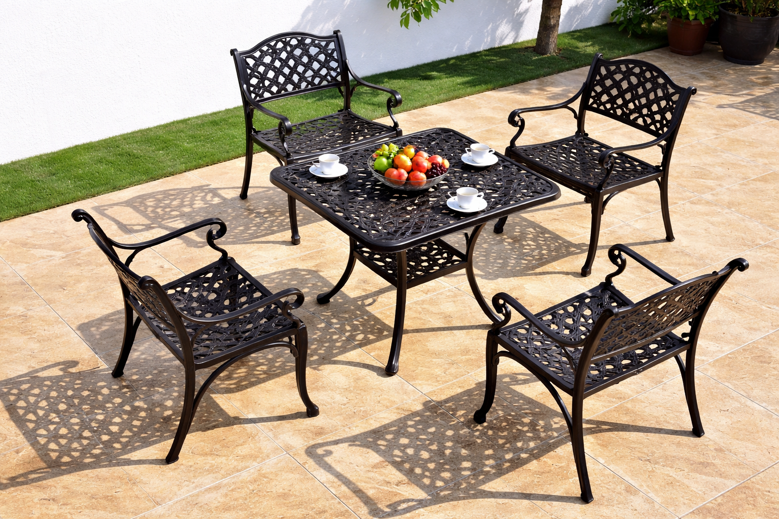 Bring timeless elegance to your outdoor space with this 5 piece classic cast-aluminium dining setting. Featuring a beautifully detailed lattice design with soft scroll arms, this set delivers a refined, European-inspired look that elevates any patio, courtyard, or garden. The solid cast-aluminium construction offers exceptional durability while remaining lightweight and easy to maintain—perfect for year-round outdoor living.