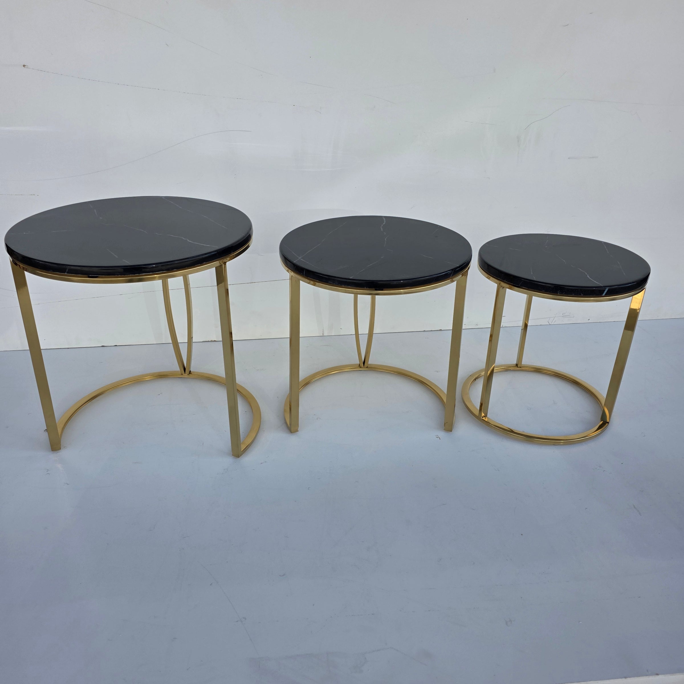 Featuring the three-piece Nested table, a beautiful combination of a silver steel legs and marble stone top. This piece divides into three with three different sizes.